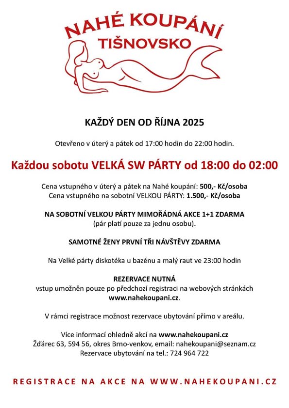 Pro Nahé koupání bude otevřeno každé úterý a pátek od 17 do 22 hod, sobotní MEGA PÁRTY zůstávají každou sobotu od 18 do 02 hod