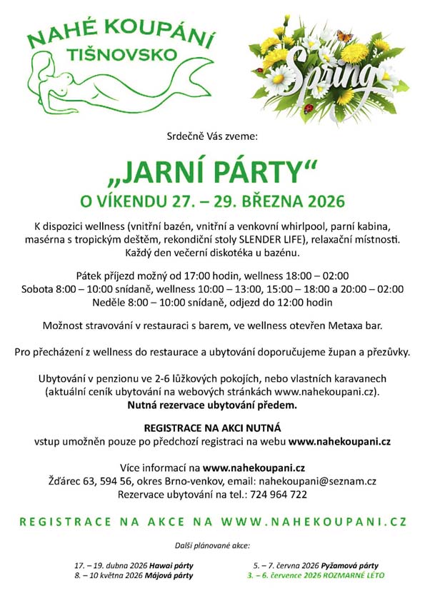Takže pro Nahé koupání je otevřeno každé úterý a čtvrtek od 17 do 22 hod, sobotní VELKÉ PÁRTY zůstávají každou sobotu od 18 do 02 hod, některé víkendy se konají tematické akce (pátek 18-02, sobota 10-02 hod)