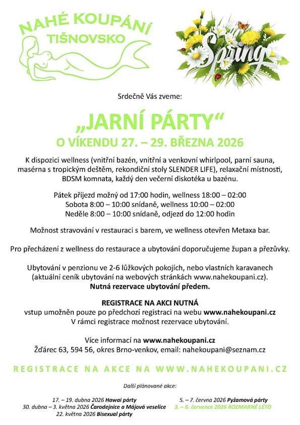 Pro Nahé koupání je otevřeno každé úterý a čtvrtek od 17 do 22 hod, sobotní VELKÉ PÁRTY zůstávají každou sobotu od 18 do 02 hod, některé víkendy se konají tematické akce (pátek 18-02, sobota 10-02 hod)