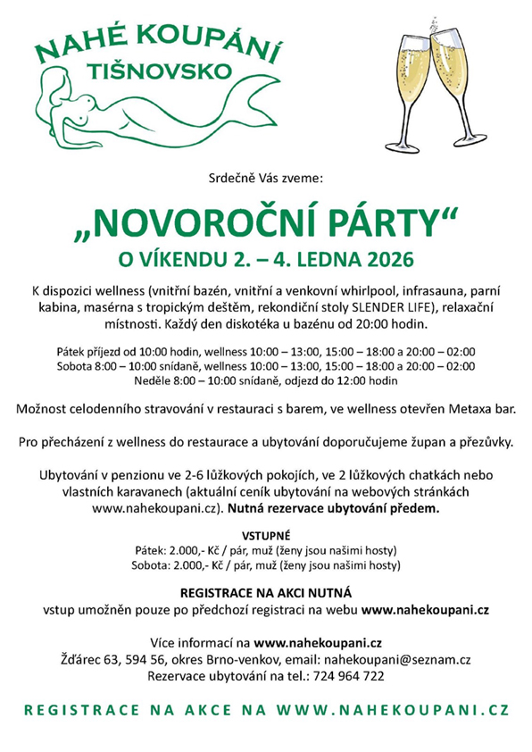 Pro Nahé koupání bude otevřeno každé úterý a pátek od 17 do 22 hod, sobotní MEGA PÁRTY zůstávají každou sobotu od 18 do 02 hod