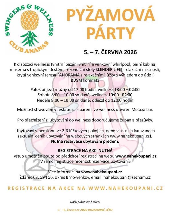 Pro Nahé koupání je otevřeno každé úterý a čtvrtek od 17 do 22 hod, sobotní VELKÉ PÁRTY zůstávají každou sobotu od 18 do 02 hod, některé víkendy se konají tematické akce (pátek 18-02, sobota 10-02 hod)